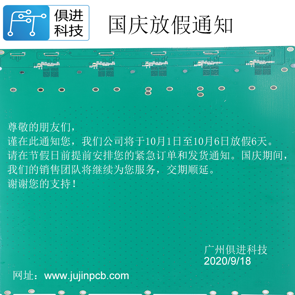 俱进科技-国庆放假安排作者: 俱进电子 / 2020年9月18日 尊敬的朋友们, 谨在此通知您,我们公司将于10月1日至10月6日放假6天。 请在节假日前提前安排您的紧急订单和发货通知。国庆期间, 我们的销售团队将继续为您服务,交期顺延。 谢谢您的支持! 广州俱进科技 2020/9/18